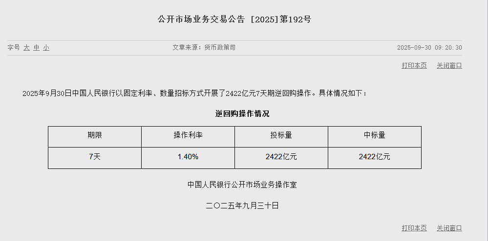 9月30日金融一线音信,2025年9月30日中国东谈主民银行以固定利率、数目招标花样开展了2422亿元7天期逆回购操作。