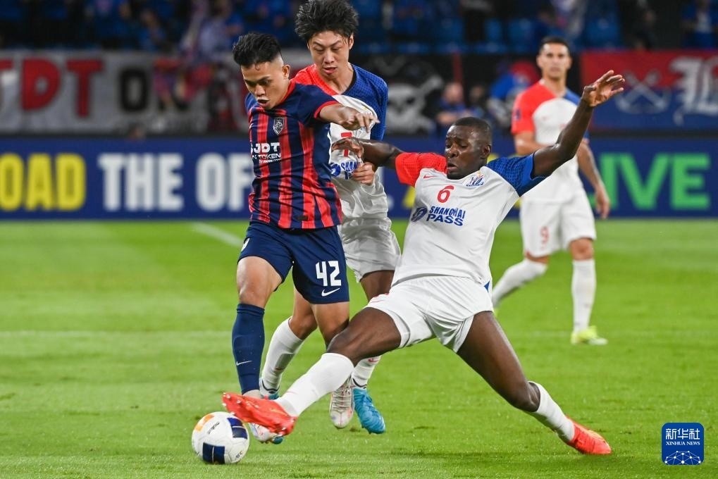 10月1日,上海申花队球员阿马杜(前右)与柔佛新山队球员阿里夫·艾曼(前左)在比赛中拼抢。